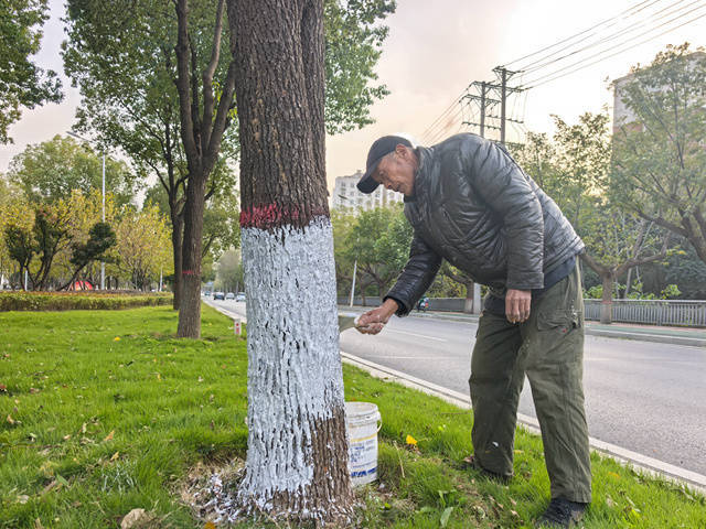 11月24日,在钢城路等主干道上,身着绿色工装的园林工人分工协作,清理树干、搅拌白灰、均匀涂刷,一道道“白色防护层”成为冬日城市别样景致。